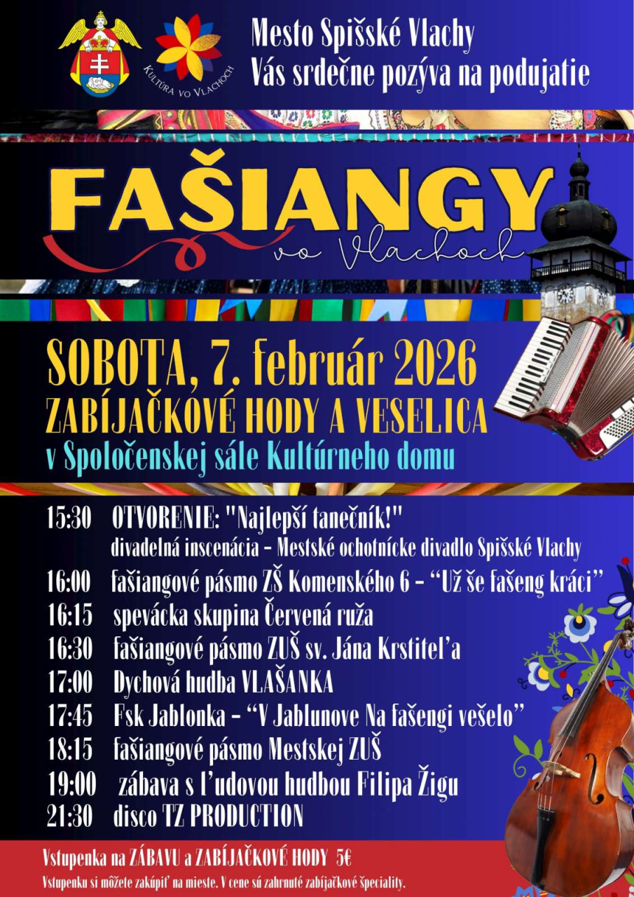 Srdečne Vás pozývame na tradičné podujatie Fašiangy vo Vlachoch, ktoré sa uskutoční v sobotu, 7. februára 2026, v Spoločenskej sále Kultúrneho domu v našom meste.