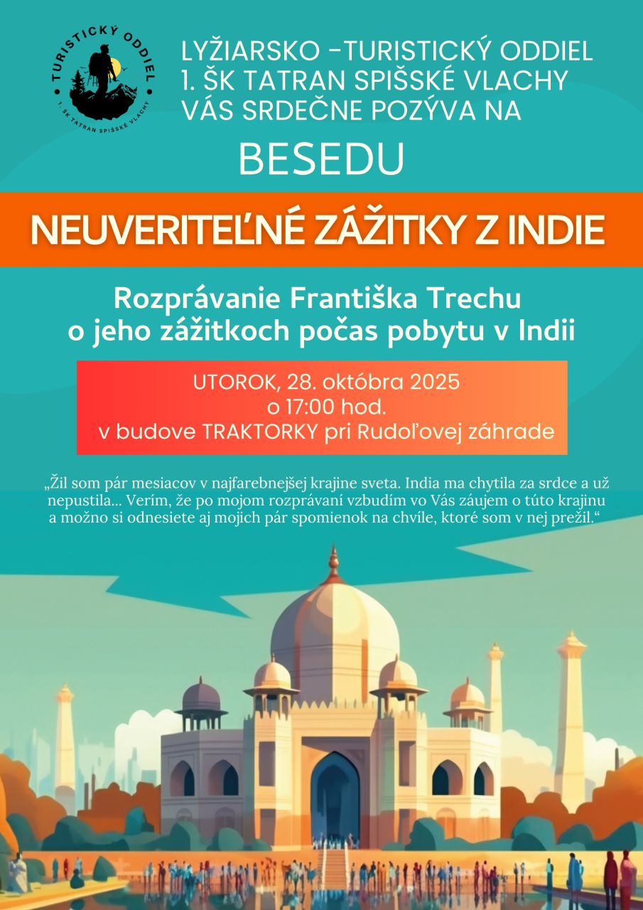 Lyžiarsko-turistický oddiel 1. ŠK Tatran Vás srdečne pozýva na besedu Rozprávanie Františka Trechu o jeho zážitkoch počas pobytu v Indii, 28.10.2025 o 17:00 v budove Traktorky pri Rudoľovej záhrade.